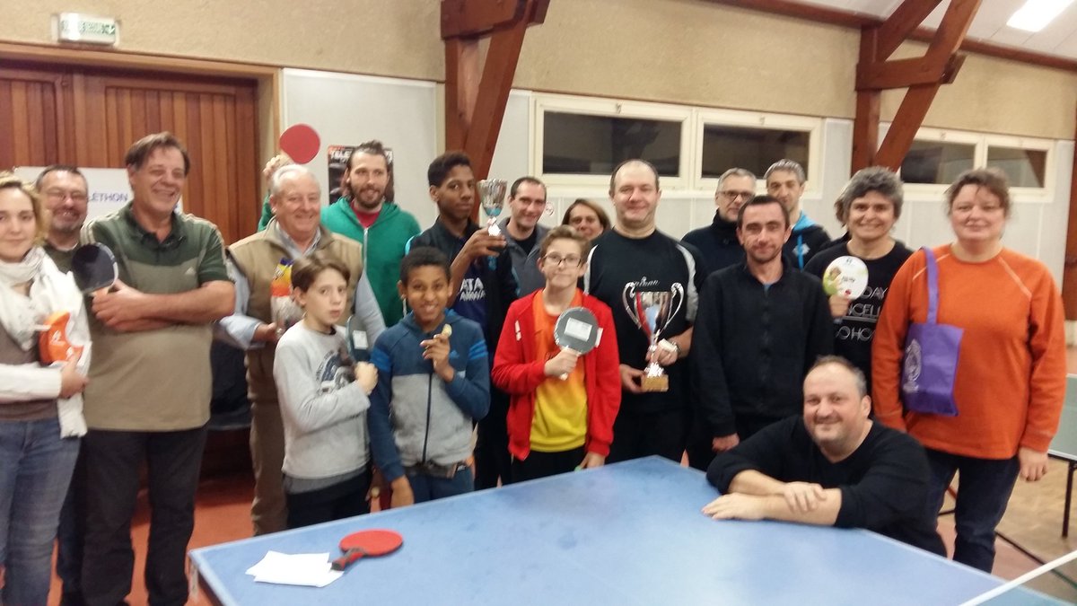 La soirée du 3 décembre fut l’occasion pour les jeunes et adultes pongistes d’échanger quelques balles et de participer à un tournoi de Ping-Pong organisé par Claude Guizol et dont les profits seront reversés au téléthon. Soirée sympathique ou le verre de l’amitié fut partagé après la traditionnelle remise de coupe aux vainqueurs. Merci à tous les participants.