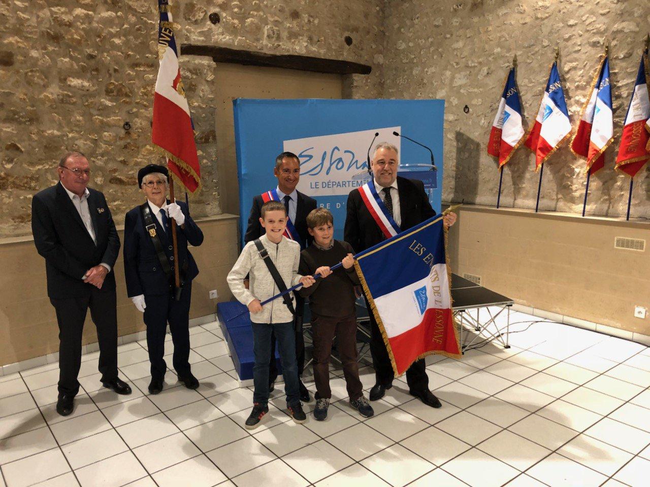 Dans le cadre du centenaire de l’armistice de 1918, le Conseil Départemental de l’Essonne a offert à toutes les communes de l’Essonne, un drapeau à l’effigie de "Les enfants de Essonne". Ce drapeau a été remis lundi 5 novembre, à deux jeunes prunaysiens Maxime Gourio et Hélias Peigne, qui représentaient notre Commune.