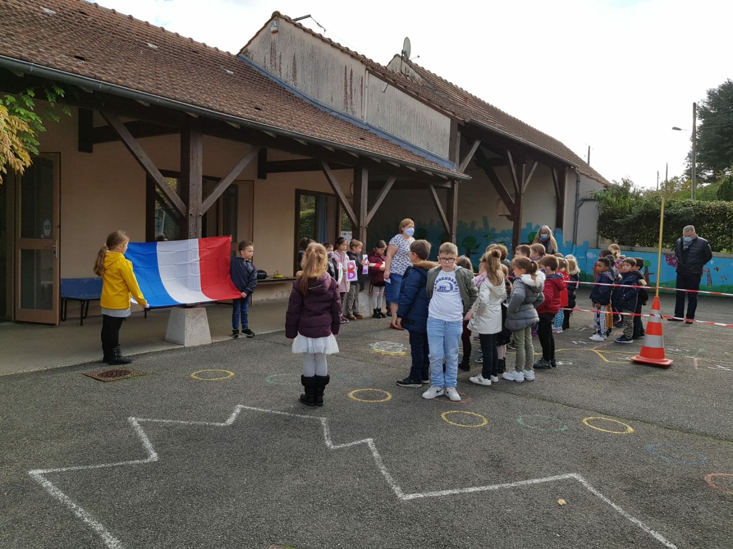 Hommage à Samuel Paty, sauvagement égorgé pas des fous furieux qui veulent la mort de notre démocratie. Marseillaise, minute de silence par les enfants de notre école accompagnés de leurs enseignantes.