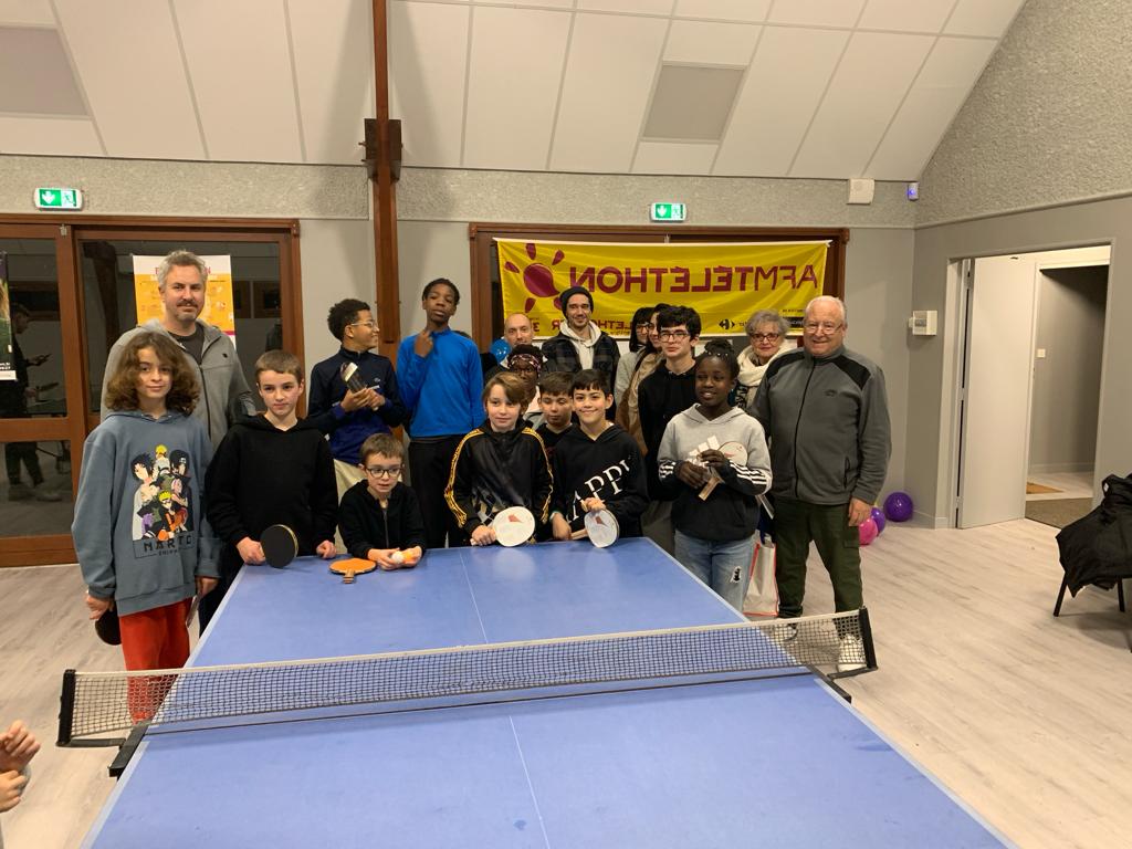 La soirée du 9 décembre, l'animation PING-PONG a mis les enfants de PRUNAY à l'honneur. 18 enfants ont participé aux jeux proposés : adresse pour les plus petits matches par poules de trois joueurs pour les plus grands. PALMARES 2023    1ére SALMA (coupe) 2ème CEDRIC 3ème ETHAN 4ème THIMOTHEE Chaque participant a été récompensé par une raquette ou lot divers . Les adultes ont échangé, d'abord en simple puis en double jusqu'à une heure tardive. La collecte de la soirée, grâce à la participation de chaque joueur et aux dons des accompagnateurs  visiteurs, a rapporté 92€, l'AMICALE complètera à hauteur de 92€ également, ainsi 184 € seront transmis à l'ASSOCIATION du TELETHON. Merci à tous pour votre élan de générosité et à votre sportivité. Il faut signalé que c’est la 23ème année que Prunay participe au TELETHON, nous avons remis les vieilles affiches datant de  l'année 2000 à la collaboratrice de l'association départementale. Les récompenses et le pot de l'amitié étaient offerts par l'AMICALE et la MAIRIE.